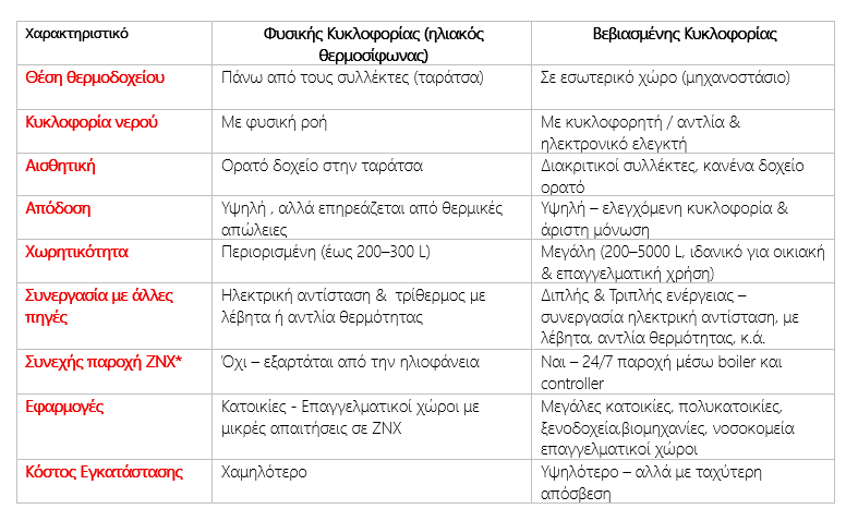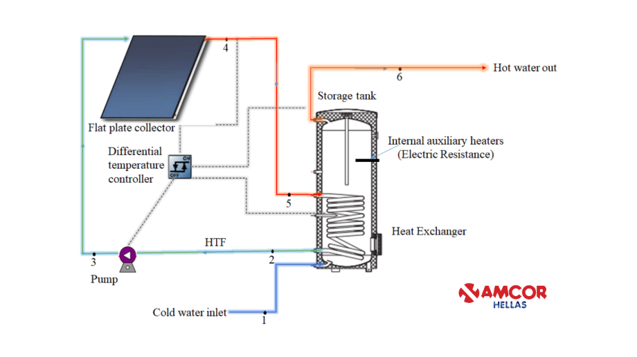 Σε αντίθεση με τους συμβατικούς ηλιακούς θερμοσίφωνες φυσικής ροής, το δοχείο αποθήκευσης (boiler) τοποθετείται σε εσωτερικό χώρο – συνήθως σε μηχανοστάσιο – και όχι εκτεθειμένο στην ταράτσα.